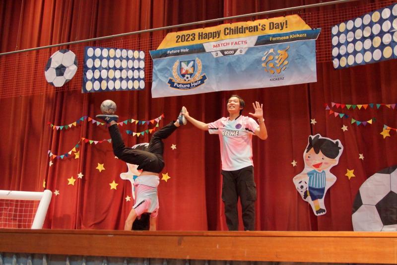 專屬於孩子們的節日—兒童節即將到來,一定要來個驚喜且讓同學們歡樂度過自己的節日,在此信念下,學校特別舉辦兒童節慶祝活動,表揚各班級模範兒童、校內楷模兒童、健康兒童,期待每位同學能向他們學習。同時也恭喜在全國學生音樂比賽榮獲優等佳績的虎克打擊樂團、節奏樂隊,以及剛獲得市長盃冠軍的足球隊,肯定他們堅持許久的努力為學校與自己爭取榮耀!陳榮富校長也列舉著近期每位孩子們的優秀表現,鼓勵著全校小朋友,要繼續保持,並且朝著小紳士小淑女繼續邁進~ 今年的校園大人物也邀請到一組在許多國際賽事上都有非常傑出表現的花式足球表演藝術家-- LAD論文小組-唐心磊、曾郁豪來校表演,他們兩位靠著絕佳的默契與技術,獲得2019中國&亞太區花式足球錦標賽團體賽冠軍以及2020日本足球協會足球挑戰活動金獎。今天他們在舞台展現了許多令人驚豔的技巧,只見足球靈巧地彈跳在各種令人意想不到的人體部位,搞笑的停球姿勢更讓全校師生佩服不已,本校足球小將們也不甘示弱地上台挑戰了挑球技巧,破百下的挑球紀錄,讓大家拍紅了手掌!同學們也一起學習了背部停球的技巧,在專業教練的引導下,果然一次成功!最幸運的當然就屬於今天生日的壽星了!從磊哥與小豪教練手中獲得一顆不停旋轉球的祝福,讓大家超級羨慕,節目的最後,他們也帶來在亞太區花式足球錦標賽團體賽獲得冠軍的表演,一場充滿驚喜與專業的表演,讓所有師生都擁有美好的回憶。 活動後,磊哥與小豪教練接受本校電台小DJ的訪問,分享著自己曾為交通大學與中央大學研究所的高材生,目前擔任工程師的工作,而他們仍不斷地追尋自己表演的夢想,協槓的人生、多重的角色與身分等精彩人生故事,期待孩子們能透過他們的親身分享,學習追夢的熱情,如何有效管理時間的技巧,認真做好每件事,一起完成每件人生的夢想清單! 冠軍足球球隊的球員們也把握這個難得的機會,一起學習基礎的花式足球技巧,每位足球小將專注又熱切的眼神感動了磊哥與小豪教練,一一示範、指導分解動作,不一會兒,一個坐姿挑球的動作就被球員們解鎖成功,驕傲又想繼續挑戰的氣氛瞬間瀰漫在球場中,我們約定,未來要繼續精進球技,一起在足球的夢想中前進! 除了精彩又勵志的表演,校園中也佈置起模範、楷模與健康兒童的表揚專區,期待同學們能向他們看齊。學校與家長會也特別準備了好吃的阿默蛋糕-達克瓦茲馬卡龍,作為兒童節點心,甜蜜蜜地祝福所有小朋友--兒童節快樂,未來也要平安健康地長大喔! |
