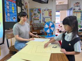 對初入小學的孩子來說,遊戲活動是最能吸引他們的投入,因此,老師們特地設計注音符號闖關活動,採用「闖關遊戲評量」的方式,來驗收孩子們對注音符號的學習成效與應用。