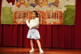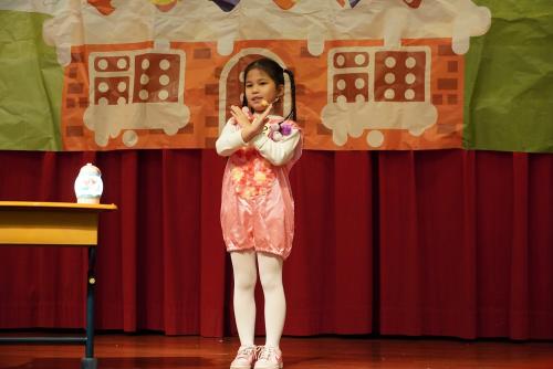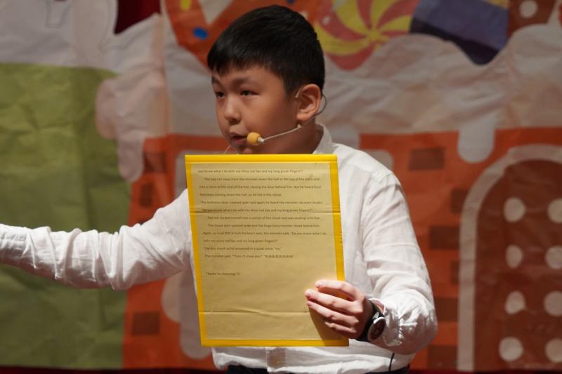 一至三年級的學生參加的是個人說故事比賽(Storytelling)。每位學生需選擇自己喜歡的故事,經過背誦、動作設計與表演練習,最終在舞台上展現學習成果。從一年級初步接觸,到三年級的成熟展現,學生們的進步令人讚嘆。今年的決賽舞台上,學生們展現了穩定且充滿創意的表現,為未來的學習奠定了基礎。