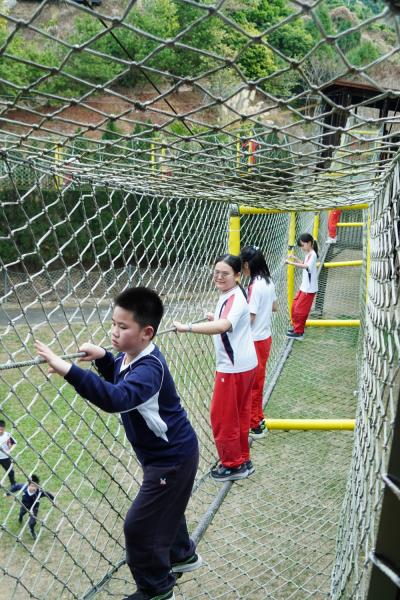 五年級學生則挑戰高空繩索關卡。在離地約三層樓高的繩索區域,他們踏上晃動的平台,學習沉著冷靜、穩定步伐,勇敢跨出每一步。正如美國著名徒手攀岩家 Alex Honnold 所展現的專注與定力,孩子們在高度與壓力中學會調整呼吸、穩住節奏,一步步跨越內心的緊張與不安。當順利完成任務的那一刻,突破自我的喜悅與成就感油然而生。