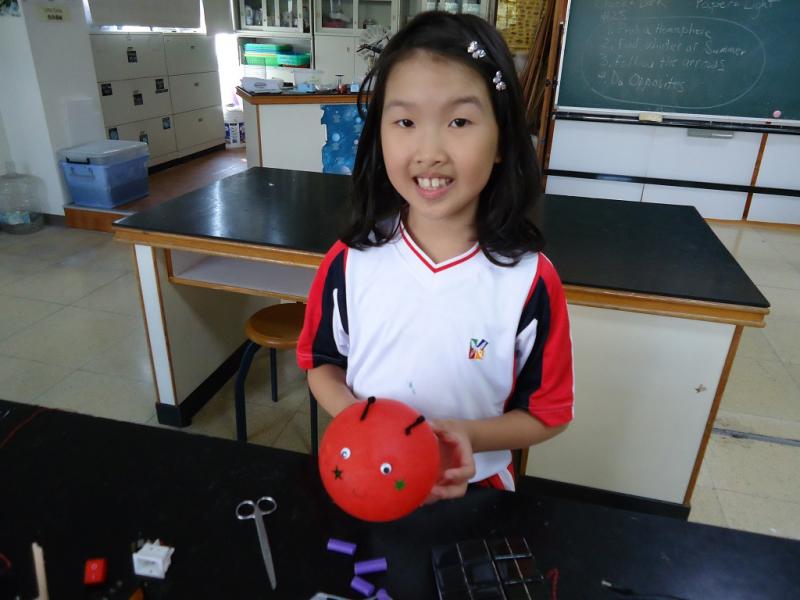 「可愛的毛毛蟲」是學校第五次參加太陽能科學創意玩具競賽的作品名稱,每一次的比賽作品在外師JC的指導下,學生不只是完成作品,過程中的學習更是給學生很大的學習及刺激,遇見困難及失敗要如何去處理解決,並讓作品的動能可以順利進行,這是一項不容易完成的任務,但我們做到了!還得到第五次的冠軍,這是選手及指導教師共同努力的成果。 此次比賽選手王予博是第二次參加,他帶領兩位五年級的學妹,沈竺宣及龔紫誼一起進行設計,作品的發想是學生們去「開心農場」進行戶外教學,發現一隻大毛毛蟲,毛毛蟲的行走方式正好可與廢棄電腦CD盒有相類似的方式「一開一合」,但是為了要讓作品呈現出毛毛蟲的行走模式,學生和老師討論使用牙刷當毛毛蟲的腳。過程中反覆的實驗及討論,是非常大的挑戰,因為摩擦力會加大,就需要用更多的動能,換句話說,需要更多的太陽能板;但相對的重量會增加,重重的困難要一一克服,選手的耐心及智慧就需要接受挑戰,他們在比賽中表現得非常亮眼,獲得裁判的青睞,再次得到冠軍,真的是實至名歸。 選手也提到:「要感謝指導老師, JC、懋勳及森裕老師,大家能不負學校的期望讓冠軍的榮譽繼續留在學校,是件開心的事,也希望明年能有更有創意的作品!」
