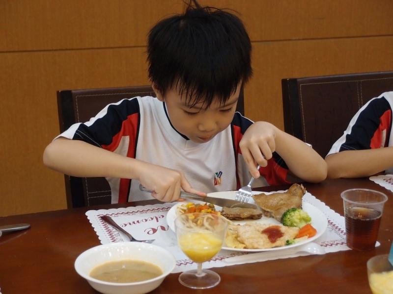 活動的現場,交響樂以及英國的特色景點—倫敦鐵橋、倫敦之眼摩天輪正歡迎著所有小朋友,當然還有好吃的英式餐點—炸魚薯條、烤雞排、番茄蔬菜湯、健康青蔬、義大利麵、布丁、紅茶等著大家。活動中的第一個挑戰—小紳士小淑女,比的是拉椅子坐下的音量分貝數,目的在於讓孩子體驗有禮貌且安靜地坐下,緊張的氣氛瀰漫著整個餐廳,因為今天獲勝的班級可是有好吃的冰淇淋作為加碼甜點喔!緊接著進行切火腿比賽,能靈活運用刀叉切出最多火腿片的班級就可以贏得勝利,每班的孩子無不絞盡腦汁讓自己的一刀發揮最大功效!在用餐開始時,老師們在席間仔細確認指導學生刀叉的使用方式,每桌也有提示小卡可以模仿學習,老師也一一解說西餐的用餐禮儀與注意事項,希望每位孩子都可以成為真正的小紳士小淑女。