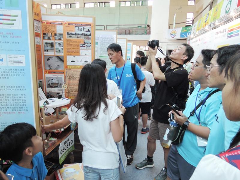 全國科展是大型的比賽,都是來自台灣各縣市的菁英,為了迎戰,孩子們前四天都過著戰鬥營般的生活,照表操課,為了更勝一籌,總是一次又一次,不厭其煩的練習解說,表現一次比一次更好!把作品的原理和應用深入淺出的解說,同時也為大家解惑。因為師生都有一個很確定的目標,就是要拿到全國第一!在7月28日,開放大眾參觀的時段,本校的作品前方吸引滿滿的人潮圍觀,好奇想知道這件有趣的作品,到底是怎麼做出來的?看見在場的觀眾熱烈和本校學生們互動與回饋,再再顯示指導老師的用心與學生們的科學精神和實力。