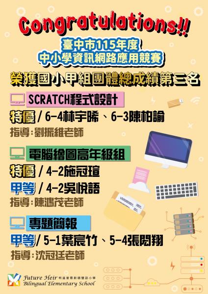 111學年度外語部語文競賽圓滿落幕,過程中遇到許多的困難,家長的配合及師生的努力還是完成一場場精彩的比賽活動,在這次比賽過程中,當然也讓每位孩子學到許多。 首先一到三年級的學生都會參加說故事比賽(Storytelling)。每位同學選出自己最喜歡的一篇故事,跟著老師訂出的時間表背誦,再加入動作與後續的調整慢慢地進步。老師們會給學生觀摩去年得獎的表演影片,從優勝者的演說中學習而發展出具有自己個人特色的演說技巧。這也是為什麼每個孩子都要參加說故事比賽,向優秀的選手們學習,再自己實際練習,並配合老師的指導,最後站在台上向老師與爸爸媽媽們展現訓練成果。從懵懵懂懂的小一學習到三年級,可以發現孩子們的演說技巧越來越成熟,也逐漸發展出屬於自己特色的技巧。今年在決賽舞台,發現許多優秀的選手,期待他們未來拿出更亮眼的表現。 升上四年級後,比賽的性質改變了;從個人的說故事比賽轉變成要分工合作的班級競賽 - 英語劇場(English Theatre)。這個比賽不只是個人的英文能力與表演技巧,還需要考驗團隊的默契,一個班要演出一齣戲;從走位、麥克風的安置、道具安排等……皆需要學生們合作完成。如何將個人的舞台魅力與班級群體的表演融合是非常重要的,同時也利用這個機會作為六年級畢業大公演前的準備。今年四年級的表演都非常精采,每一個班的表現都非常優秀,也讓評審老師傷透了腦筋到底該如何決定名次,真希望所有的班級都能榮獲冠軍的榮耀呢! 五年級進行更高難度的比賽 - 演講(Speech)。學生要自己寫出一篇說服性作文(Persuasive Essay),在講臺上將自己的想法用嚴謹的組織架構傳遞出來,說服大家同意自己的論點。說服性作文的結構可以簡單用口訣OREO來說明:意見(opinion)、原因(reason)、舉例(example)、意見(opinion);開門破題先表達自己對於探討主題的意見,接著陳述原因來支持自己的意見,再舉例來強化原因的說服力,最後再次重申自己對主題的意見作為結尾。不乏出現許多參賽者展現出文情並茂、條理清晰的演說,講得台下的觀眾都被說服了! 六年級則是進行朗讀比賽(Read Aloud),今年的選手陣容堅強異常,每位選手將故事背得滾瓜爛熟,任意抽其中一篇故事都能輕鬆駕馭,表現得淋漓盡致,相信所有的聽眾都沉浸在故事的情境中,每位選手優秀的表現,老師和家長們都備感欣慰,覺得普小孩子的英文程度真的在學校獲得非常好的訓練,我們的準畢業生們離開校門都夠代表明道普霖斯頓雙語小學! 外語部英語文競賽給予了學生一個呈現所學的舞台,就連活動主持人都是由學生擔任,四年級學生兩人一組上台主持,訓練技巧與膽量;先向師長們打招呼,接著介紹評審、說明規則,並一一邀請選手上台,最後則是代表學校給予評審、師長及家長們感謝!表現得落落大方,這就是學校努力栽培的成果,讓我們期待來年的更精采的比賽活動。 |