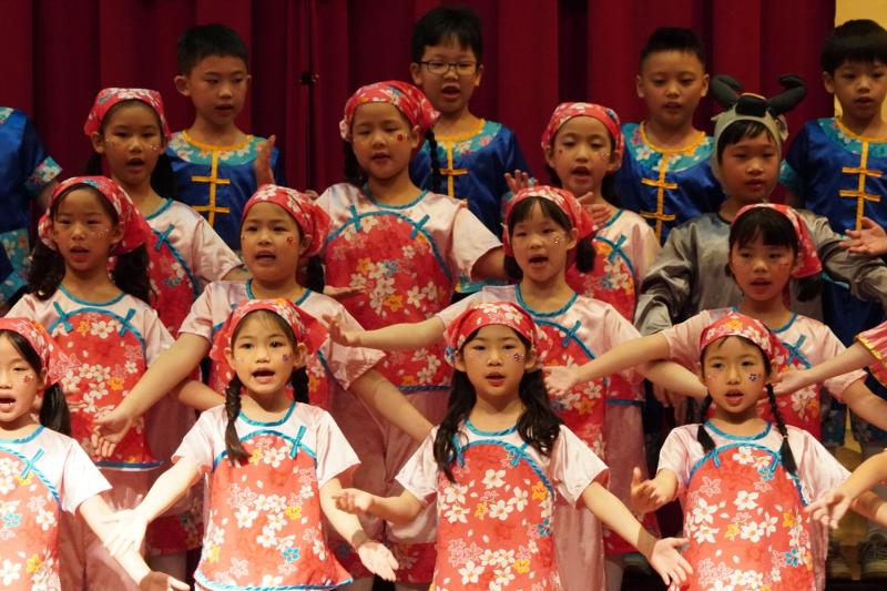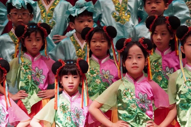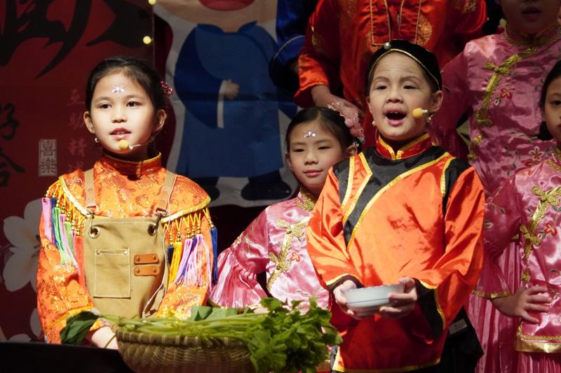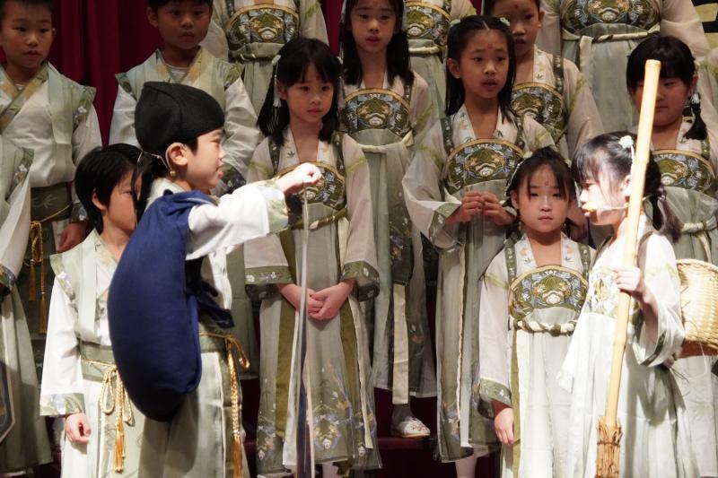 在經過一次又一次的練習與排演,詩詞吟唱比賽首先登場的是二年級,由宜芳老師主持。孩子們換上了古裝,神采奕奕,信心滿滿,準備迎接比賽。二年級比賽的曲目:《池上》是一首五言古詩,描寫小孩偷偷採白蓮的趣事,展現孩子的天真與淘氣,畫面生動有趣,讓人感受到純真的童年情景。《憫農詩》描寫農夫辛苦種田的不容易,提醒我們食物得來不易,要珍惜每一粒米,也要學會感恩別人的付出。《新嫁娘》是唐代詩人王建的作品,詩中表現新媳婦小心適應新家庭的心情,孩子們用可愛又自然的表演,把詩中的情境活潑的呈現出來。《尋隱者不遇》描寫詩人上山尋訪隱者,雖未見到隱士,卻透過松林、白雲和童子對話,呈現隱士的高潔與山林幽靜。孩子們用了福建調、江西調、河南調、黃梅調等古調吟唱,充份展現古詩詞的意境,小朋友也在詩意的演繹中,穿插了有意義又有趣的話劇,演出十分精彩又富有童趣。